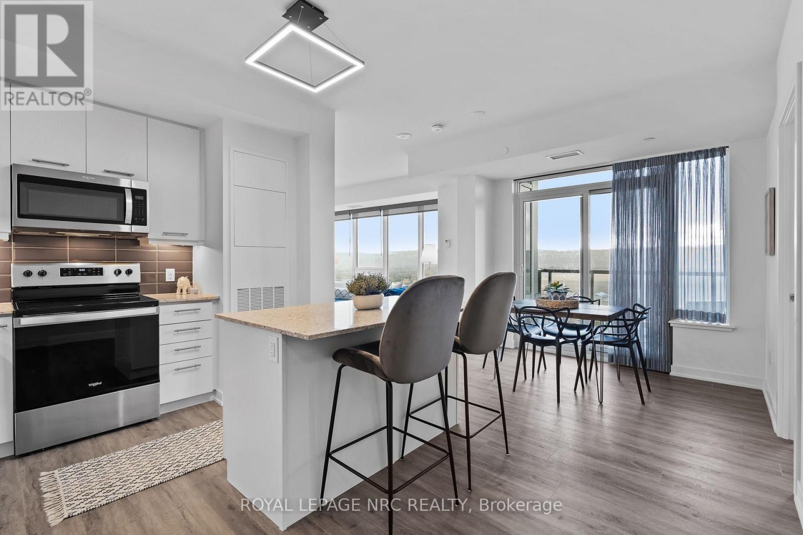 Luxury has a way of reshaping the rhythm of everyday life, and at 385 Winston Road, that feeling begins long before you reach your front door. The lobby welcomes you with a clean, modern aesthetic and 24-hour concierge, creating a sense of calm that carries throughout. Amenities unfold seamlessly like scenes from a well-curated lifestyle. Mornings start in the fitness room or yoga studio, while afternoons lead to the rooftop terrace, where panoramic lake views make even small moments feel meaningful. Celebrations take on a special quality in the beautifully appointed party room, complete with a kitchenette and bathrooms. The pet spa adds convenience to lakeside living, while underground parking keeps winter worries at bay. Every detail of the building is designed to elevate life with both purpose and elegance, and the suite itself builds on that experience. Floor-to-ceiling windows draw the eye toward the lake, letting natural light move softly through the space. Two balconies invite you to begin your mornings with fresh air and end your evenings above the shoreline. The kitchen is a canvas for your favourite meals with stainless steel appliances, soft-close cabinetry, and an island perfect for cooking and conversation. Nearby, the dining area is ready for intimate meals and leads into a living room that faces the lake, instantly slowing the pace of your day. The primary suite offers a double closet and a 3-piece ensuite, while the second bedroom enjoys its own lakeside view. A 4-piece bath sits conveniently off the foyer for guests. Step outside and the lifestyle continues. Grimsby-on-the-Lake is known for its boutique shops, restaurants, cafes, and charming waterfront community. Scenic paths, everyday conveniences, and quick access to the highway make commuting and errands effortless while keeping the lake always in view. With light, connection, and quiet luxury by the water, the charm of this property is not just in its walls, but in the life it promises. (id:60063)